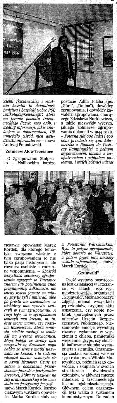 Pierwszego marca, w Narodowy Dzień Pamięci Żołnierzy wyklętych, odbył się w Muzeum Ziemi Nadnoteckiej w Trzciance wernisaż wystawy zatytułowanej "Prześladowani na Ziemi Trzcianeckiej w latach 1945 - 1956. Otwarciu wystawy towarzyszyła prelekcja Marka Kordka na temat Zgrupowania Stołpecko - Nalibockiego Armii Krajowej.