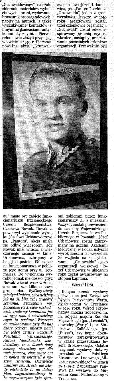 Część wystawy poświęcona jest działającej w Trzciance w latach 1950 - 1951, młodzieżowej organizacji "Grunwald". Można zobaczyć zdjęcia niemal wszystkich jej członków, oryginał aktu oskarżenia, czy kopie notatek sporządzanych przez oficerów Urzędu Bezpieczeństwa Publicznego. Niesamowite emocje wywołują różańce wykonane w więzieniu z chleba, pamiętniki więzienne, gryps, czy chustki haftowane słomką wyciągniętą z siennika. Organizacja została założona wiosną 1950 roku przez Witolda Majewskiego, późniejszego dowódcę, i skupiała w swoich strukturach dwudziestu członków, w głównej mierze młodzież z trzcianeckiego liceum ogólnokształcącego. Głównym celem organizacji była walka z systemem komunistycznym. Do zadań "Grunwaldowców" należało zbieranie materiałów wybuchowych i broni, wydawanie broszurek propagandowych, napisy na murach, a także wyszukiwanie kontaktów z innymi organizacjami antykomunistycznymi. Pierwsi członkowie złożyli przysięgę w kwietniu 1950 r. Pierwszą poważną akcją "Grunwaldu" miało być zabicie funkcjonariuszu trzcianeckiego Urzędu Bezpieczeństwa, Czesława Nowak. Dowódca powierzył wykonanie wyroku Józefowi Urbanowiczowi ps. "Pantera". Akcja miała się odbyć wieczorem, gdy Nowak miał wracać z wieczornego seansu w kinie. Urbanowicz, uzbrojony w belgijski pistolet FN czekał na funkcjonariusza w pobliżu jego domu przy ul. Tetmajera. Do wykonania wyroku jednak nie doszło, gdyż Nowak wracał wraz z żoną, a za nimi szła kilkuosobowa grupa ludzi. - Byliśmy wtedy młodymi ludźmi, wiedzieliśmy jak na UB biją, żeby wydobyć zeznania. Szczególnie my, pochodzący z kresów wschodnich, znaliśmy komunizm już od 1939 roku i wiedzieliśmy czym to pachnie. Wzorcem do naśladowania były dla nas Szare Szeregi, między nami był jeden czynny uczestnik Powstania Warszawskiego, Antoni Nowakowski, wiedzieliśmy, że w lasach dalej walczą, chcieliśmy być dla nich pomocą, choć może oni do końca nie wiedzieli o naszym istnieniu. Oczywiście czuliśmy lęk, strach, ale wtedy odchodziło to na dalszy plan, bagatelizowaliśmy to, bo najważniejsza była sprawa - mówi Józef Urbanowicz, ps. "Pantera", członek "Grunwaldu", jeden z gości wernisażu. Jeszcze w 1950 roku aresztowani zostali trzej członkowie organizacji, "Grunwald" został zdekonspirowany jesienią 1951 r., wkrótce nastąpiły aresztowania pozostałych członków organizacji. Przeważnie byli oni zabierani przez funkcjonariuszy UB z mieszkań. Wszyscy zostali przewiezieni do siedziby Wojewódzkiego Urzędu Bezpieczeństwa Publicznego w Poznaniu. Józef Urbanowicz został zatrzymany na uczelni, Akademii Medycznej w Łodzi, usłyszał wyrok sześciu lat więzienia. Ze względu na sklasyfikowanie "Grunwaldu" jako organizacji wojskowej, Józef Urbanowicz w ubiegłym roku został awansowany na stopień kapitana.