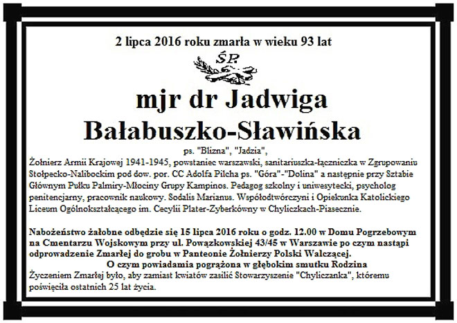 Pogrzeb śp.mjr dr Jadwigi Bałabuszko - Sławińskiej ps. "Jadzia", "Blizna" odbędzie się w Warszawie w piątek dnia 15 lipca 2016 roku na cmentarzu Wojskowe Powązki o godz. 12.00. Msza św. odbędzie się w kaplicy na cmentarzu, ok. godz. 11.00. Prosimy o wcześniejsze przybycie.