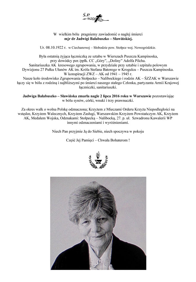W dniu 2 lipca 2016 r. odeszła od nas na zawsze ta niezwykła kobieta, ostatnia łączniczka w Wierszach ze sztabu cichociemnego por.-ppłk "Góry"- "Doliny" Adolfa Pilcha, Weteran Walki o Niepodległość Rzeczypospolitej Polskiej major WP dr Jadwiga Bałąbuszko -Sławińska ps "Blizna" Ta niewykła kobieta żołnierz Związku Walki Zbrojnej, a następnie Armii Krajowej walkę z dwoma wrogami rozpoczęła w 1941 roku w Nowikach. Nie tylko była łączniczką między placówkami ZWZ w Rubieżewiczach, Derewnem, Mińskiem, Iwieńcem, a Stołpcami, ale też prowadziła w domu swych rodziców komplety tajnego nauczania. W marcu 1943 r wstąpiła jako ochotniczka do Zgrupowania Stołpecko - Nalibockiego Armii Krajowej mianowana wkrótce, w uznaniu zasług na placu boju, starszym ułanem w 27 Pułku Ułanów im. Króla Stefana Batorego dowodzonym przez znakomitego zagończyka chor./rotm. Zdzisława Nurkiewicza ps. "Noc", "Nieczaj". Razem z tym zgrupowaniem , z którym przebyła szlak bojowy z Puszczy Nalibockiej do Puszczy Kampinoskiej, wyzwalając z pod okupacji niemieckiej na czas Powstania Warszawskiego rozległy jej teren i biorąc udział w Powstaniu Warszawskiem. Chociaż tam, w Puszczy Kampinoskiej została oddelegowana do sztabu dowództwa jako łączniczka, będąc zwolniona z obowiązków sanitariuszki, na ochotnika wyjeżdżała na wszystkie wypady naszej kawalerii, pieczołowicie zajmując się rannymi odtransportowanymi do polowego szpitala na Krogulcu lub do Lasek. Nie kłaniała się kulom, w czasie walki gdy usłyszała wśród świstu kul i huku rozrywających się pocisków jęki rannych, natychmiast zwinnie czołgała się w tamtym kierunku udzielając rannym pierwszej pomocy. Szlak bojowy Doliniaków przerwała pod Jaktorowem, gdzie 29 września 1944 roku stoczyła się największa bitwa partyzancka na terenie Polski, w której "Grupa Kampinos" została rozbita przez przeważające siły niemieckie. "Jadzia" miała możliwość wyrwać się z kotła i przedrzeć się z por. "Doliną" - Adolfem Pilchem i dowódcą 27 pułku ułanów chor. rtm "Nieczajem": - Zdzisławem Nurkiewiczem do lasów kieleckich. Bohaterska amazonka nie skorzystała z okazji, pozostała przy rannych, których wraz z innymi naszymi sanitariuszkami, po opatrzeniu ran , usuwała z pola walki przemieszczając w bezpieczne miejsce, dostarczając im następnie zaopatrywała ich w fałszywe dokumenty i cywilne ubrania dostarczane przez miejscowe komórki konspiracyjne. A jednak nie zerwała łączności z oddziałem Doliny, który po bitwie pod Jaktorowem przemierzał kielecczyznę wzdłuż i wszerz, przemieszczając się z jednego miejsca postoju na drugie, niemal dokładnie maszerując tropem oddziału ostatniego żołnierza II Rzeczypospolitej Polskiej i pierwszego partyzanta majora " Hubala" - Henryka Dobrzańskiego.