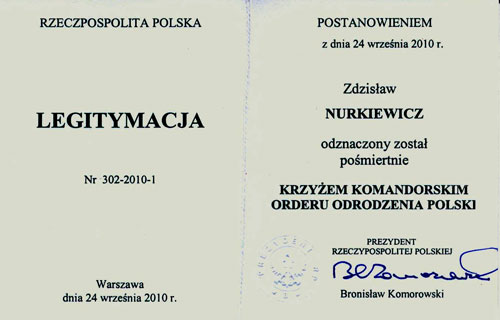 W dniu 6 czerwca 2011 r w Pałacu Prezydenckim, prezes Zarządu Koła Środowiska Żołnierzy Zgrupowania Stołpecko - Nalibockiego AK Maciej Downar Zapolski, wraz z małżonką Elżbietą, odebrał nadany pośmiertnie przez Prezydenta RP Bronisława Komorowskiego, jego ojcu, rotmistrzowi Zdzisławowi Nurkiewiczowi ps. "Noc", "Nieczaj" Krzyż Komandorski Orderu Odrodzenia Polski.