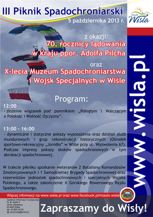 W Wiśle 5 paźdzernika odbył się Trzeci Piknik Spadochronowy poświęcony pamięci ppłk. A. Pilcha "Doliny" w 70-tą rocznicę jego skoku, do kraju (dn. 16/17 luty 1943 r.) jako cichociemnego, żołnierza Armii Krajowej z rozkazami Rządu Polskiego z Londynu, oraz 10-lecie miejscowego Muzeum Spadochroniarzy i Cichociemnych im. ppłk. Adolfa Pilcha "Góry", "Doliny".