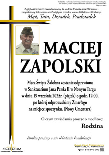 W wieku 78 lat zmarł Maciej Zapolski z Nowego Targu, syn rotmistrza Armii Krajowej Zdzisława Nurkiewicza ps. "Nieczaj", ostatniego dowódcy 27. Pułku Ułanów im. Króla Stefana Batorego, oraz Urszuli Koczarskiej ps. „Ula”.