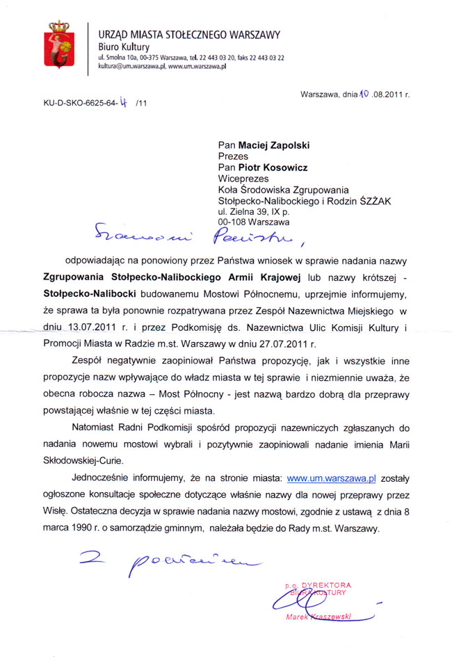 Pismo Urzędu Miasta Stołecznego Warszawy