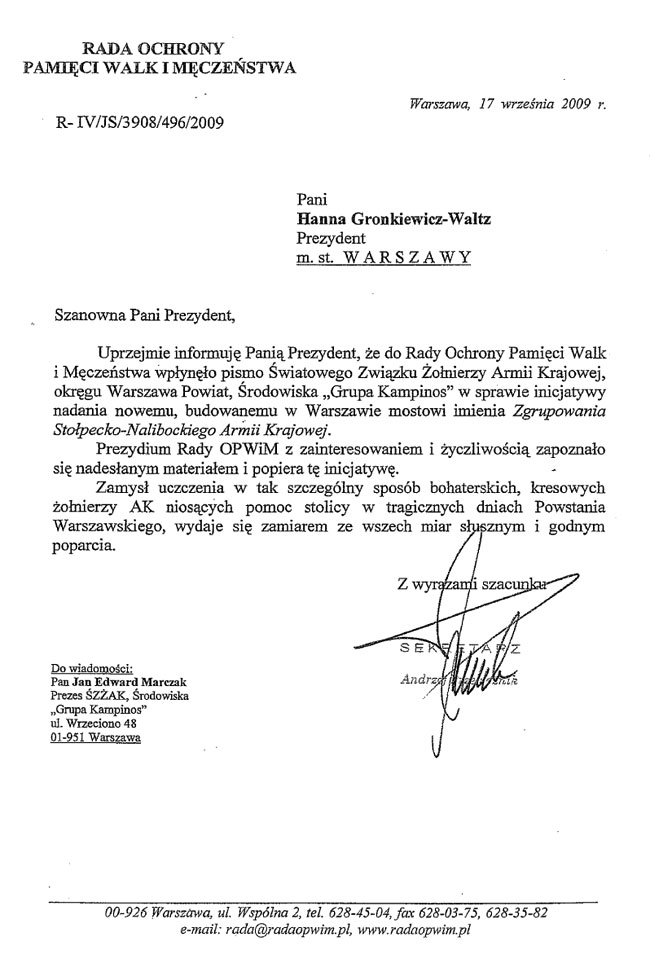 Pismo Sekretarza Rady Ochrony Pamięci Walk i Męczeństwa
