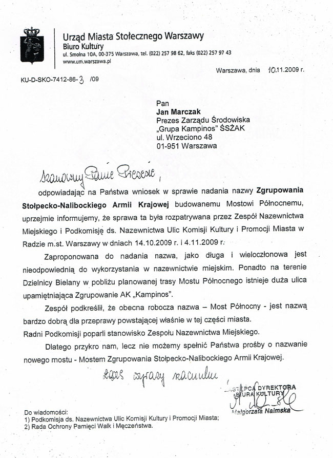 Odpowiedź UMSW na wniosek o nadanie nazwy Most Stołpecko - Nalibocki